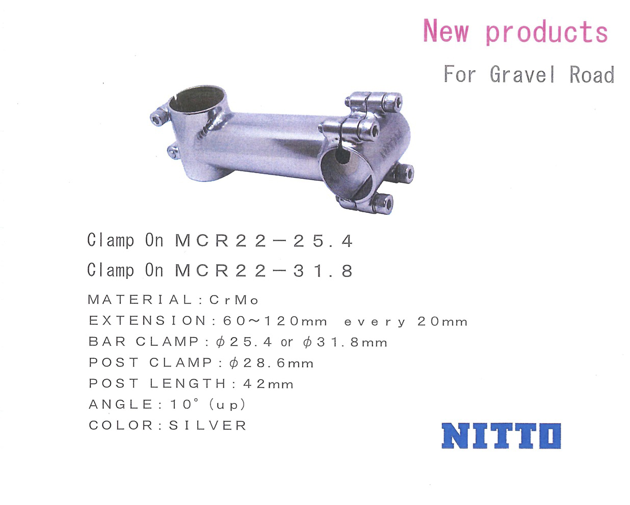 | 詳細 | N05STM02704 | 4580575301628 | クランプオンMCR22-31.8 DB 120ミリ 新 日東 | ¥7,600 |