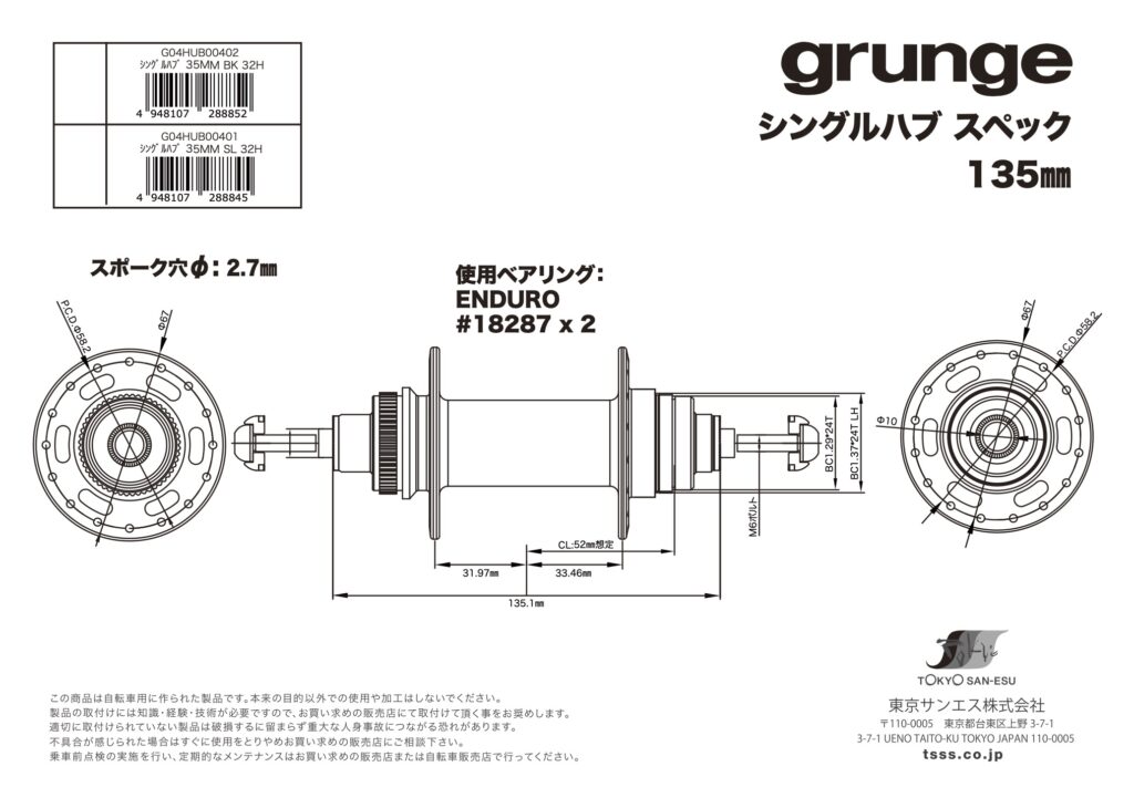 | G04HUB00401 | 4948107288845 | シングルハブ 135MM SL 32H | ¥19,800(税抜¥18,000) |