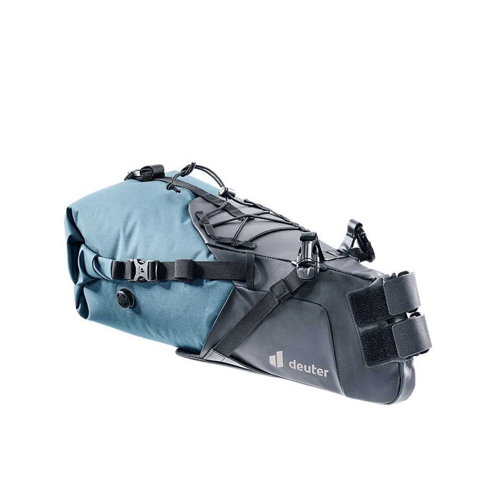 輪行時や目的地に到着してからの持ち運びを素早く可能にする2ピース構造を採用したウォータープルーフ素材を用いたサドルバッグ。