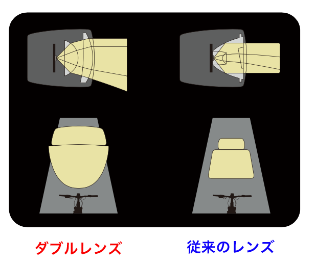 レンズにはダブルレンズ分散技術により、ライトの拡散範囲が広くワイドでありながら、暖かく柔らかい光を発するので、安心して走行が可能に。
